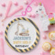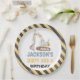 Dirty 3rdy Birthday paper plate featuring an excavator and a yellow and black striped pattern..