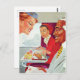 Stewardess is serving a man in aeroplane, under the watchful eye of his wife.