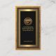 A simple artistic design of intertwining rectangular borders made from faux gold colours. At the top, you have your prestigious name which sits above an exquisite faux gold logo of a gold car tire rim which you can use. Just below this, in a black column, you have your job title and the contact details.