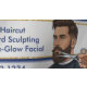 The professional layout clearly displays some of your service menu -Haircut, Beard Sculpting, and Hydra-Glow Facial- in clean, bold typography that clients can read effortlessly.