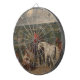 This design features a painting by the English artist John Frederick Herring Sr. (1795–1865). It shows a traditional rural scene with horses being ridden across a dirt path. The horses are owned by the King of England. There are trees growing on the grass in the distance. The horses are of different colours: one of the horse has white hair while the other horses have coats of different shades of brown. Two elegant women are seated beside the path.