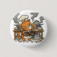This funny button features a tired orange chef cat standing in a smoky, messy kitchen after a cooking disaster, surrounded by burnt food, pots, and kitchen tools.