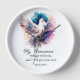 Christian wall clock with inspirational quote scripture depicts a beautiful white dove flying through the sky, its wings adorned with blue and lavender splashes of paint. It features an encouraging Bible Verse Exodus 33:14, “My Presence will go with you, and I will give you rest.”
