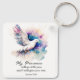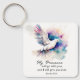 Keychain with inspirational quote scripture depicts a beautiful white dove flying through the sky, its wings adorned with blue and lavender splashes of paint. It features an encouraging Bible Verse Exodus 33:14, “My Presence will go with you, and I will give you rest.”