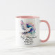 Christian coffee mug with inspirational quote scripture depicts a beautiful white dove flying through the sky, its wings adorned with blue and lavender splashes of paint. It features an encouraging Bible Verse Exodus 33:14, “My Presence will go with you, and I will give you rest.”