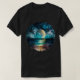 A decorative watercolor landscape painting of a tropical beach with palm trees after sunset.