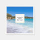 Paper napkins with a photograph featuring a beach on the Greek island Crete. A beautiful tropical blue beach with foamy surf. Wonderful tranquil travel destination.