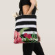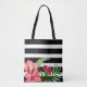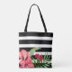 Simple black and white stripes and exotic pink flowers. Customisable tote bag template