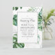 Trendy long distance baby or bridal shower by mail invitation featuring green tropical beach leaves and a black and white geometric pattern.