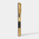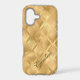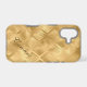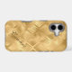 This shiny phone case has an exotic geometric background in tones of gold and gold brown. The diamond shapes in the pattern have lines that resemble palm leaves. Your name is written in script in brown gold at the lower right. Pretty!