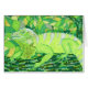 This striking green striped iguana is sitting on a highly detailed tree branch against a background of numerous verdant jungle leaves in this intriguing monochromatic green image.