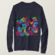Abstract design on black background with green grass leaf half-timbering symbolizes the common point of Spain and New Zealand for being antipods. New Zealand kiwi slices blend with the Spanish fans, with the passion red color and pink tones of Spain, the blue of the Mediterranean and the green of New Zealand.