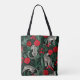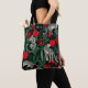 This tote is designed with an exotic leopard jungle floral pattern with palms and foliage, red roses and flowers and beautiful spotted leopards over a contrasting black background. A decorative black tab in the upper centre of the design has a text template for you to personalise with your desired monogram. The colour combinations of red, green, black and beige used in this design are rich and vibrant.
