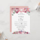 Beautiful exotic protea floral arrangements in chic shades of pink and purple, wedding invitation. Back of card features solid sunset pink colour.