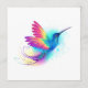 Bright, iridescent, exotic flying hummingbird on white background, painted over with multicolor, watercolor paint. Rainbow hummingbird.