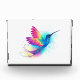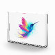 Bright, iridescent, exotic flying hummingbird on white background, painted over with multicolor, watercolor paint. Rainbow hummingbird.