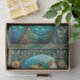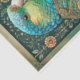 A richly detailed parrot portrait of a bright blue and green bird adorned in ornate steampunk accessories. The parrot’s feathers transition from aqua to emerald and deep teal. Around its neck rests an elaborate metallic collar set with embellishments, blending natural beauty with intricate mechanical design. Surrounding the bird is a coordinating background of scrollwork and stylised medallions, all in gold tones. Artwork similar to a digitally painted fantasy illustration…..COLOR COMBINATIONS: Teal, turquoise, emerald green, brass, ochre, and navy…..PERFECT FOR: