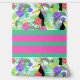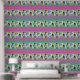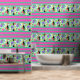 A bold modern tropical flowers and bird peel and stick wallpaper design with bold colours of aqua, green, and red violet. A stunning modern style for a tropical feel, combining tropical elements and horizontal stripes.