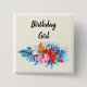Birthday girl button with a vibrant and beautiful tropical flower bouquet. Orchids, hibiscus and tropical leaves. Pink, turquoise, red and blue colours.