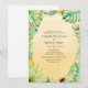 Summer engagement party invitation featuring abundant tropical greenery, strelitzia flowers, a toucan bird, pineapple, ice cream and a gold geometric frame.