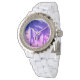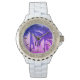 Exotic women's watch with palm tree photo image. Upload your own picture optionally. Girly white bracelet watch band and bezel with crystals. Modern no number dial face with custom monogram letters. Elegant Birthday gift idea for women and girls. Create one for girlfriend, daughter, sister, mum, cousin, wedding bride, bridesmaid etc. Tropical print with neon pink and purple filter.