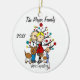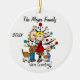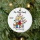 A pretty round ceramic keepsake Christmas holiday ornament features a stick figure couple expecting a baby and a small toddler boy standing in front of a decorated Christmas tree, a brown dog, brown cat, and text that reads "We're Expecting!". You can personalise this cute stick figure ornament by adding your names and current year!
