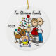 A pretty round ceramic keepsake Christmas holiday ornament features a stick figure family including a dad, expectant mum, girl, toddler boy, cat, and the family dog in front of a decorated Christmas tree with areas you can customise with your family name and the current year! This cute holiday keepsake ornament makes a great gift for the young family to commemorate a special year!