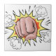 A pop art cartoon fist hand with a comic book crash explosion graphic
