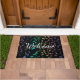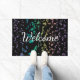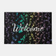Exploding Rainbow Notes Music Doormat Welcome Mat. Blue green purple gold pink and lavender musical notes explode outwards from the centre on a black mat with customisable Welcome text. Perfect for outside your studio or home and a great gift for your favourite musician or music lover. The text can stay as is or change it to whatever you prefer.