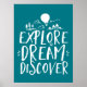 A cool hand lettering typography design poster with travel quote. Explore dream discover. Climb a mountain, ride hot air balloon or explore the jungle. Background colour can be customised to your desired colour.