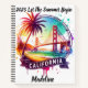 A stunning portrayal of California's coastline showcases the iconic Golden Gate Bridge. The colourful sunset illuminates palm trees, waves, and a lively atmosphere, inviting exploration.