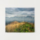 Woman standing on the mountain with beautiful green and yellow foliage with cloudy sky and mountains behind on Kobilja Glava, Slovenia.