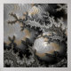 A spherical object with a reflective surface sits prominently among complex, fractal-like patterns with various shades of gray, black, and gold. The intricate patterns appear almost like a textured landscape, while the sphere acts like a lens distorting and compressing the surrounding details.