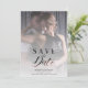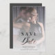 The "Save the Date" text is delicately cut out over a transparency that overlays the couple's photo, creating a stunning cut paper effect. This detail elegantly stands out against the image, adding a unique and memorable visual touch. The back of the card features a dedicated space for personalized comments and the couple's initials, allowing for further customization of the design.