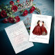 Below the dolls, a delicate floral garland in burgundy tones adorns the card, creating an ethereal veil effect that wraps the design in an air of mystery and romance. This effect extends to the back of the invitation, where the event details are presented with clarity and elegance, with the same floral garland under the translucent veil subtly sliding to ensure that the text is clearly appreciated.