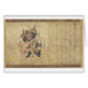 A 12th century Japanese colour print. The scene depicted comes from a Buddhist tale relates about Shōki. Shoki is a demon-slaying deity from China, who according to legend protected the Tang emperor Xuanzong (685-762) from evil demons. He is portrayed with large eyes and a thick beard and is wearing a black robe and tall black boots. Here, he is shown strangling a small demon. He's also wearing a large red hat, which almost looks like it's on fire. The artist has signed or written about the famous tale on the left in what looks like Kanji characters and Hiragana (the Japanese writing).
