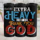 This grateful design expresses "EXTRA HEAVY ON THE THANK YOU GOD." "HEAVY" stands out in a textured blue, while "THANK YOU" is in a warm orange. "GOD" is prominently featured in a bold red plaid pattern, accompanied by a small heart, conveying profound gratitude for blessings.