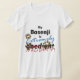 My Basenji is Extremely NAUGHTY! Obedient is crossed out, and naughty written in. Funny Basenji gifts that dog lovers will find hilarious! The design also features mud splatters (with a silhouette inside), paw prints, and bite marks out of the word obedient.