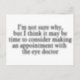 A humourous, simple card to use to remind your patients that it's time to schedule an appointment for their annual eye exam. Features blurry text, designed to make the point that it becomes difficult to see when one's glasses prescription is not up to date. All text on the back of the card is customisable.