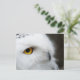 A photograph of the profile view of a beautiful white snowy owl with gold eyes.