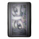 A pair of shining eyes peek from behind an oriental fan. Black and white with subtle shading. Bordered with complementary colours and a silver frame. Hand-painted signed original art.