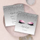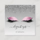 This elegant makeup artist business card features a pair of pink glitter eyes on a silver grey ombre background, with a top border of dripping silver faux glitter. Customise it with your business name in black handwriting script with swashes at the beginning and end, and your contact information in black sans serif font. (To keep the swashes, replace only the letters in those text fields, leaving the symbols in place.)