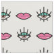 White fabric with a kitschy seamless pattern of glossy pink lips and blue eyes with yellow eye-shadow and long lashes.