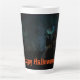 This spooky black cat Latte mug is certainly frightening. This mug features a Halloween scene with a haunted house, and a background of a watchful black cat.
