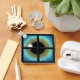 Eye Through Window © Sunny Mars Designs. This cool and unique premium small square keychain or keyring features a graphic illustration design of a striking bright blue eye iris looking through a window with a black frame.