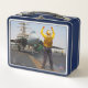 This is a standard metal lunchbox that appears to work just fine. We designed this box ourselves with an uploaded photo and custom text on the front and back. It looks absolutely beautiful except the front of the lunchbox is not centered like it shows in the photo. The print borders don't align with the inset flat part of the box where the preview photo online showed it perfectly centered in there. The back looks nice and centered though.