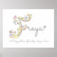 Pretty F monogram art name poster perfect for a girls bedroom or playroom in shades of grey, white, yellow, pink and purple. Personalize with your child's own name beginning with F, and name meaning for a truly personalized touch to your child's bedroom or nursery, this example is for the name F Freya A lady goddess of beauty and pure love. Cute poster print ideal for a new baby, christening or baby shower gift. © Unique F monogram hearts and flowers drawing description and graphic art design by Sarah Trett. www.sarahtrett.com for www.mylittleeden.com