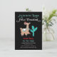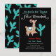 Fa la la llama Feliz Navidad winter party invitations with a Llama dressed for the holidays wearing a santa hat with ribbons and bows around her long neck, happily dancing next to a christmas cactus. Matching item on this one! Great for any age!