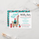 Fa la la Llama Holiday party invitations with a Llama dressed for the holiday in a funky santa hat with ribbons and bows around her long neck. Stacks of teal, red and black gifts on the saddle with candy cane dividers. Striped candycane back. Matching item on this one! Great for a holiday, christmas or gift exchange.