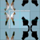 Images of two cats are replicated in mirrored tile effect. Black cat connects to itself at the tail, forming an "X". Multicolored cat connects at head and back, to outline a diamond shape. Medium blue background may be customized.